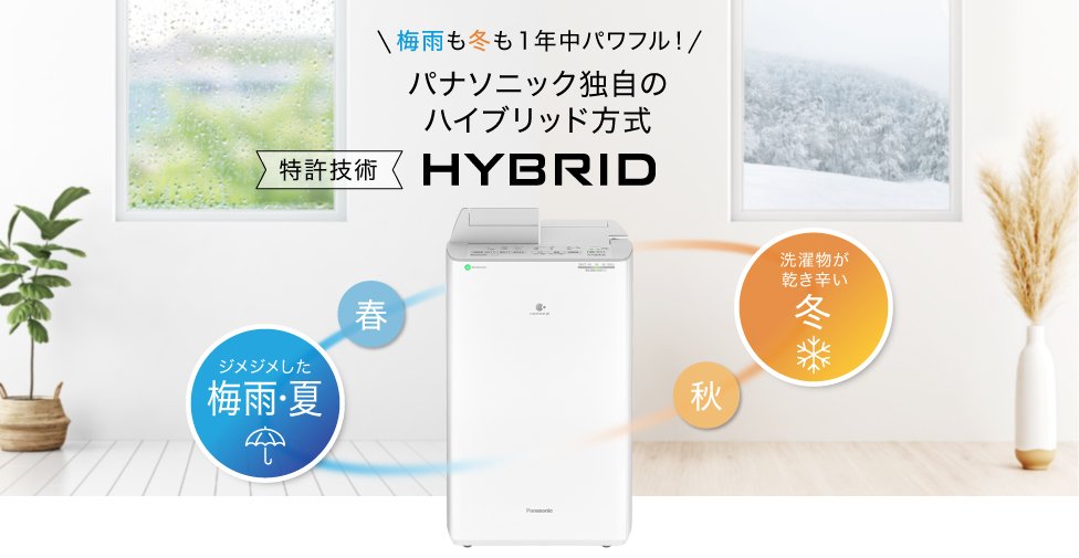 コンプレッサー方式とデシカント方式のメリットを1台にまとめ、デメリットを克服した、パナソニック独自の除湿方式です。気温に左右されにくく、梅雨も冬も1年中優れた除湿力を発揮します。