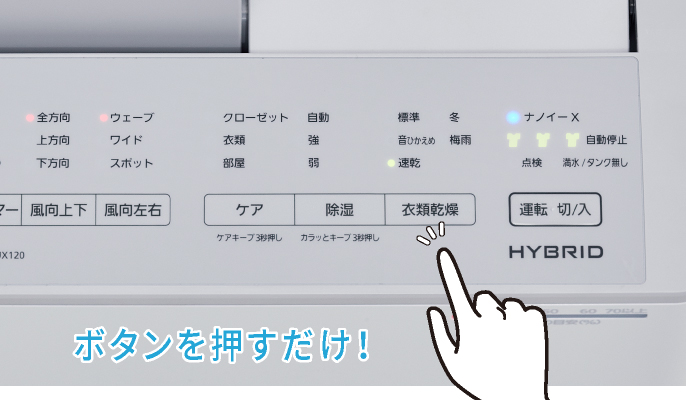 難しい操作がなく、ボタンが押すだけで乾燥がスタートするのもありがたい点です。わずらわしい事前の設定なども一切不要。洗濯物を干してボタンを押すだけOK。カラッとセンサーが付いているので、乾燥が終わったら自動で運転が停止します。